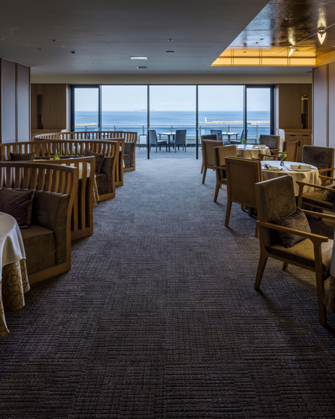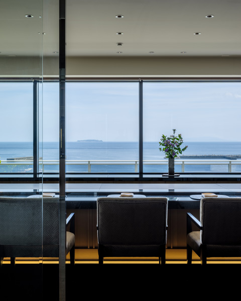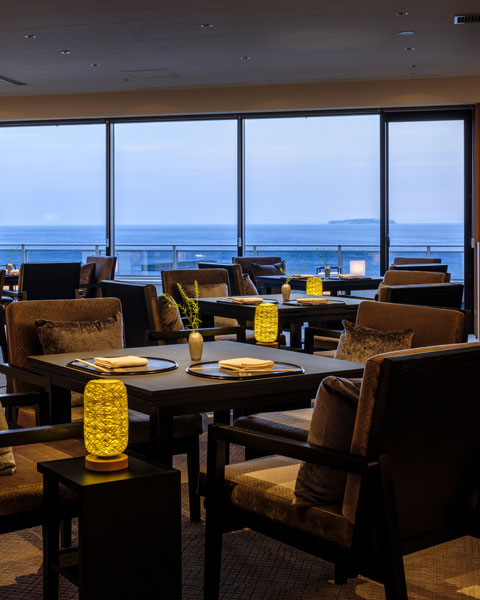 熱海の海を背景に、5つのレストランとバーが仕切られることなく集まったシームレスなダイニングフロア。