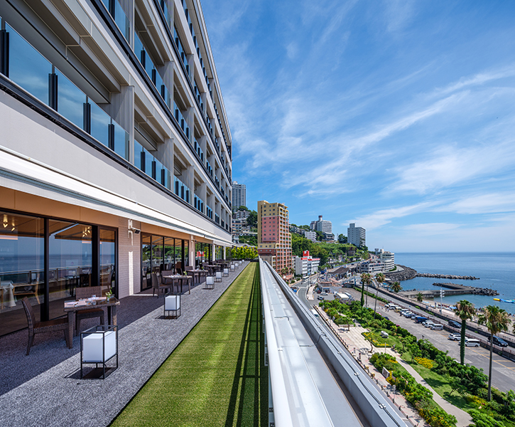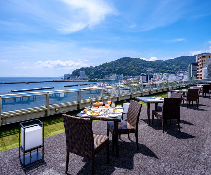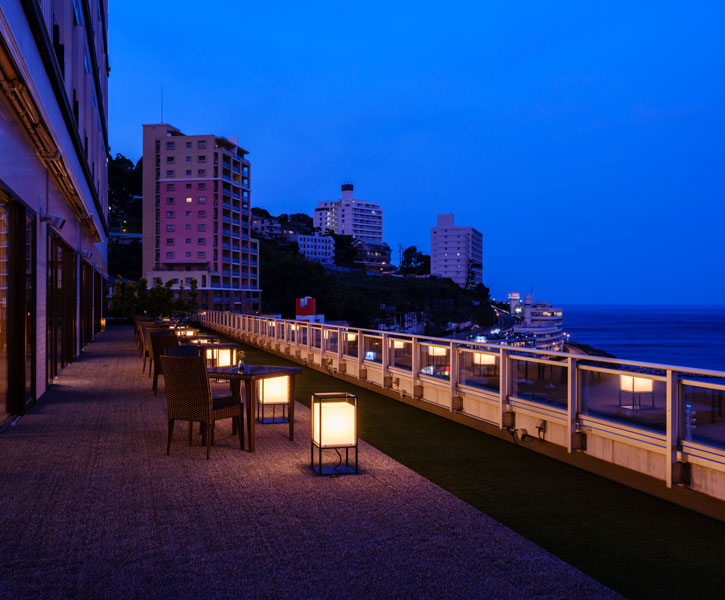 海と空を独り占めする贅沢なテラス時間 目覚めた後テラスに赴くと、爽やかな潮風が出迎えてくれます。陽光に海が煌めき、どこまでも続く碧空がゲストにくつろぎの時間を提供してくれます。熱海湾を一望できる眺めが爽快なテラス席です。 夕刻のテラスとガゼボでプライベート空間を楽しむ 夕刻の静かに流れる時間。月光が映りこむ熱海の海。テーブルキャンドルの明かりがともり、昼とは違うシーンをお楽しみいただけます。 レストラン一覧ページに戻る
