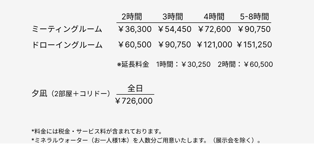 「熱海」×「働く」×「休む」 海と山に囲まれた静岡県熱海市。日帰りや宿泊、目的に合わせて多様な過ごし方ができ、「働く」と「休む」のワーケーションに最適な滞在場所です。 熱海パールスターホテルではワーケーションにぴったりのミーティングルーム、セミナーや展示会などにもご利用いただけるドローイングルームをご用意しております。 お見積りフォーム テーブルプラン ドローイングルーム ミーティングルーム 収容人数一覧 / Capacity Chart 面積 Size タテ・ヨコ Dimensions 天井高 Height スクール Classroom シアター Theater コの字 U-shape ロの字 Hollow Square 長卓 Long table 丸卓 Round table アイランド Island ドローイングルーム Drawing room 29坪 / 98㎡ 11.7 × 8.1m 2.9m 20名 30名 20名 24名 20名 5卓5名=25名 4卓8名 =32名 ミーティングルーム Meeting room 6坪 / 21㎡ 5.5 × 3.8m 2.9m – – – – – – – 設備 ドローイングルーム LAN回線、ホワイトボード、50インチ液晶TV、ウエブカメラ、プロジェクター、スクリーン(サイズ)、有線マイク、ワイヤレス2本 ミーティングルーム LAN回線、ホワイトボード、50インチ液晶TV、ウエブカメラ ※ステーショナリーセット(ライティングパッド、レターヘッド、ボールペン)ご用意可能です。 ※上記設備のご利用料は会議室代金に含まれます。 各室ご利用料金 1部屋のみ、下記の時間単位でもご利用いただけます。 お見積りフォーム MEETING PACKAGE 夕凪 ドローイングルーム・ミーティングルーム両方をご利用いただけるパッケージプラン。 フライヤー フルディパッケージ 料金 ¥18,150(お一人様) 利用人数:8~32名様 利用時間:8時間 ワーキングランチ付き 蕎麦御前or飛騨牛ステーキサンド 事前にお選びください。 ドリンク付き コーヒー、紅茶、ミネラルウォーター、リフレッシュメント セルフスタイルでご利用ください。 ハーフディパッケージ 料金 ¥8,470(お一人様) 利用人数:8~32名様 利用時間:4時間 ドリンク付き コーヒー、紅茶、ミネラルウォーター、リフレッシュメント セルフスタイルでご利用ください。 ※8名様未満でもご利用可能です。ただし8名様分のパッケージ料金を頂戴いたします。 会議・催事規約 お見積りフォーム ビジネスの後は、当ホテルでくつろぎのひと時を。 ご宿泊も伴うワーケーションはいかがでしょうか。 宿泊プラン クラブラウンジ 過ごし方 営業時間・ご予約 ご利用時間9:00~21:00 ご予約・お問合せ0557ー83ー5489(10:00~18:00)