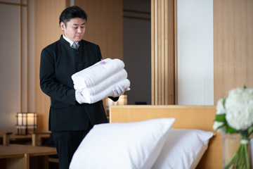 最高の満足とくつろぎのために 快適にお過ごしいただけるよう気配りの行きとどいたおもてなし。 ご満足いただくためのきめ細やかな心づかい ホテルに着いたその瞬間から、お客様のために心をこめてお手伝いいたします。ご滞在中はお気軽に何なりとお申し付けください。 クラブラウンジでのドリンク 靴磨き 配車の手配 チケットの予約、手配 書類のコピーなど事務作業のお手伝い 手紙の投函 お荷物、お土産の発送 観光のご案内 ショッピングのご相談 アニバーサリー演出のお手伝い ご就寝の準備 お部屋のアレンジ 荷ほどき、荷造り クラブラウンジでのドリンク 靴磨き アイロンがけ 配車の手配 チケットの予約、手配 書類のコピーなど事務作業のお手伝い 手紙の投函 お荷物、お土産の発送 観光のご案内 ショッピングのご相談 アニバーサリー演出のお手伝い ご就寝の準備 お部屋のアレンジ 当ホテルのホスピタリティは全てのお部屋に提供いたします。 快適にお過ごしいただくためにお部屋をアレンジし、お好みの寝具やお花などをご用意することも。 SPECIAL INTERVIEW 最高のサービスの出発点と、感動を生みだす理念 私は1986年にオープンした「ホテル西洋銀座」の開業準備や運営に携わり、2001年に日本で初めてバトラーサービスを導入しました。私自身、ヘッドバトラーを務めてまいりましたが、その経験を生かし、「熱海パールスターホテル」でも最上のバトラーサービスをご提供いたします。バトラーとは元来、貴族のお屋敷で主人の意向を使用人に伝える執事のことを指しますが、現在ではホテルに宿泊中のお客様に快適にお過ごしいただくための、ホテルとゲストの橋渡し役として認知されています。バトラーのミッションは、お客様のホテルでの滞在がより快適になるお手伝いをすることです。画一的なサービスではなく、お客様をお名前でお呼びするのはもちろんの事、お客様一人一人の趣味嗜好を把握した上できめ細かなサービスをご提供いたします。「熱海パールスターホテル」ならではのバトラーサービスを存分にご活用いただき、熱海での最高のひと時をお過ごしください。 安達実(熱海パールスターホテル 総支配人) 1961年生まれ。大学卒業後、 1986年ホテル西洋銀座・開業準備室入社。料飲部、宿泊部を経て、 2001年バトラ一部門を設立。初代ヘッドバトラーとして従事する。2007年にはバトラーなど多くのサービスの経験を活かし「いつまでも心に残るサービスの実践」を執筆、出版する。 2012年には沖縄でラグジュアリーリゾートホテルを経営しているテラスホテルズに入社しその中のザ・テラスクラブ アット ブセナで従業員のサービス向上を目的とした教育を主とするシニアエキスパートとして 5年半従事する。また日本独自のバトラーを追求するべく旅館の支配人も歴任し、今までの経験の集大成として熱海パールスターホテルの総支配人に就任。色々な施設や部署など様々なところでのサービスを実践した経験から、他業種のサービス研修においてアドバイスを求められることも多い。