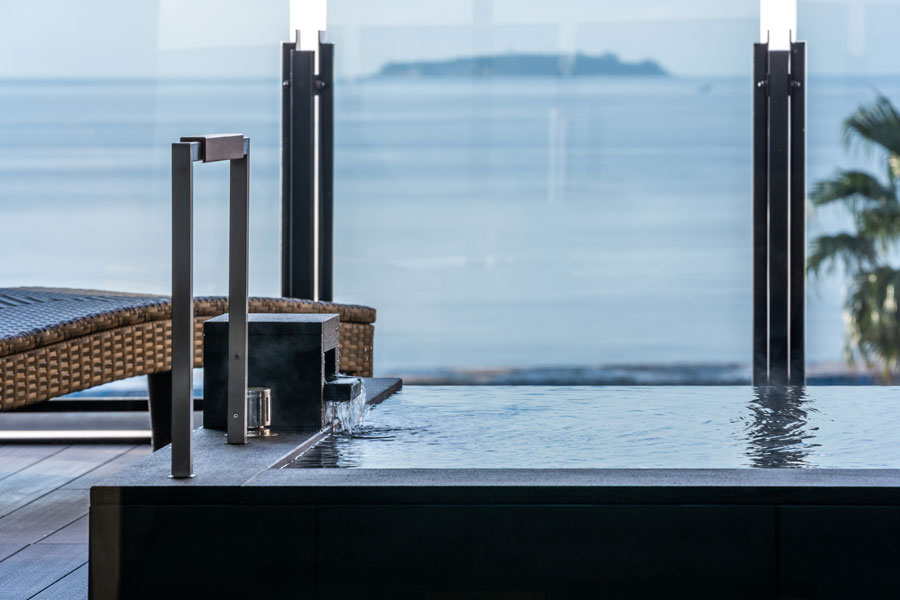テラスに設えられた露天風呂でゆっくりと手足を伸ばせば、まるで熱海の海と空を手にしたような感覚に。特別な熱海を、ご家族や気の合う仲間と心ゆくまでお楽しみください。