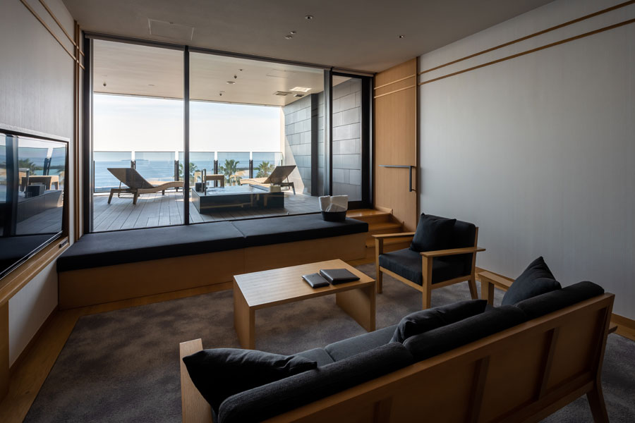 露店風呂付きテラスと広々としたリビングを備えたお部屋で、海に向かってストレートに抜ける空間が心地よい開放感を与えてくれます。喧騒を忘れさせる静寂の中、心よりおくつろぎいただけます。