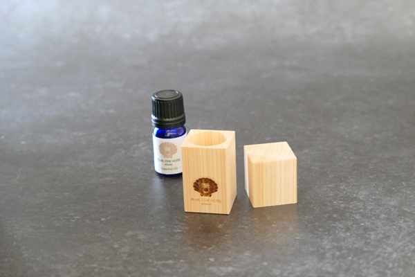 熱海の名産品「だいだい」。毎年契約農家さんから2〜3t買い取り、減圧水蒸気蒸留法で良質な精油を蒸留して作る精油。熱海パールスターホテルの香りは奥行きのあるウッディノートの温もりと余韻を感じるホテルオリジナル。熱海だいだいとお宮の松をオマージュしたパインツリー(松)の香りに加えてパチュリ、ホーウッドをブレンドした香りをロビーと客室フロアに展開しています。
