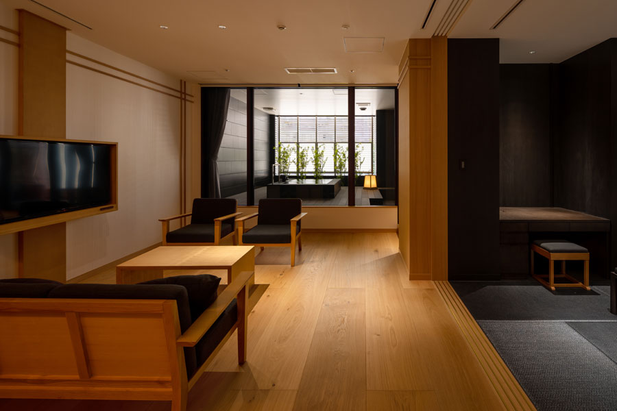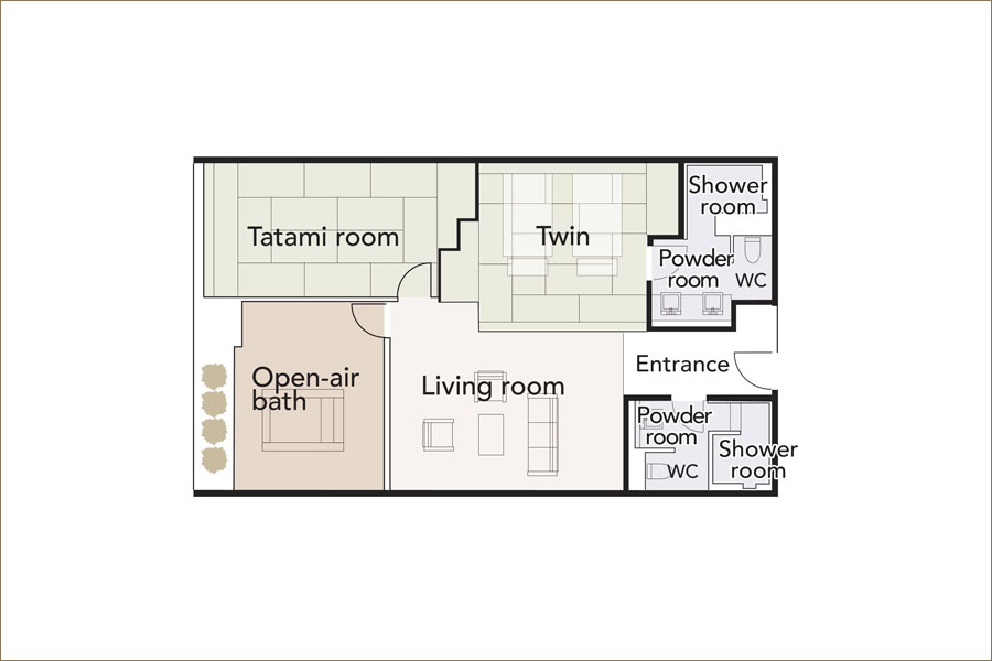 喧騒を忘れさせるヒルサイドに面したお部屋で、広々とした畳敷のリビングとベッドルームを備えています。一緒に滞在する方が気兼ねなくご利用できるよう、シャワールーム、パウダールーム、トイレも別々に設置。テラスバスからは四季折々に変化する自然の表情がお楽しみいただけます。