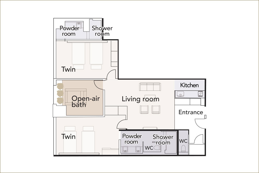 2つのベッドルームに挟まれるように位置するテラスバスが特徴的。自然が身近に感じられるヒルサイドに面し、ご家族や親しい仲間どうしで贅沢な時間を心ゆくまでお楽しみいただけます。キッチンのほか、シャワールーム、パウダールームも別々にご用意しているため、長期滞在にも適しています。